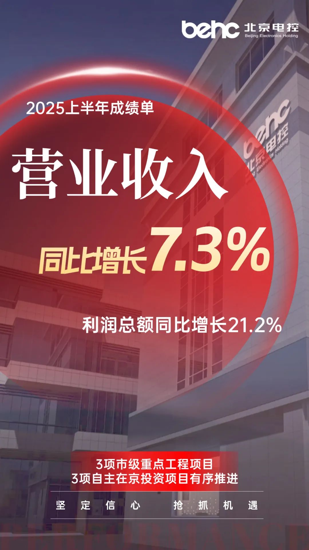 2025上半年,北京电控着力抓好经济运行和党的建设各项工作,扎实推进年度重点战略任务,在发展新质生产力上聚势赋能,产业发展取得显著成效,顺利达成“时间过半、任务过半”目标,为全年目标任务达成奠定坚实基础。勤劳笃行结硕果,接续奋斗创新高,北京电控全体干部职工将继续团结奋斗,以更加饱满、更加焕发的精神状态迎接北京电控第四次党代会胜利召开,为首都经济发展贡献电控力量。