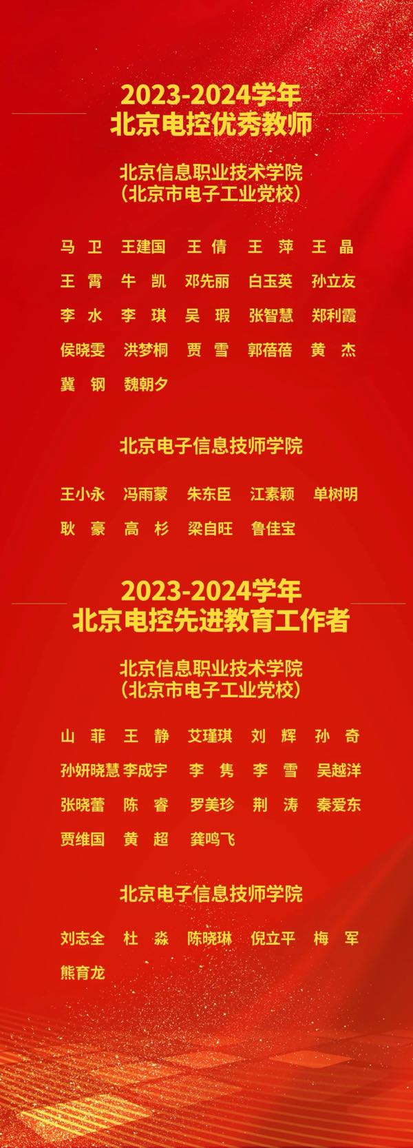 长期以来,北京电控高度重视职业教育工作,充分发挥行业办学优势,推动产教融合发展。所属信息学院(电子党校)、技师学院紧紧围绕电子信息产业,落实立德树人根本任务,为电控乃至全市产业发展提供了人才支撑。广大教师和教育工作者立足本职岗位,敢于担当,对学校教育事业发展倾注了大量心血,为北京电控高水平建设芯屏产业生态作出积极贡献,涌现出一批先进典型。经电控党委研究决定,授予马卫等31名同志“2023-2024 学年北京电控优秀教师”称号,授予山菲等24名同志“2023-2024学年北京电控先进教育工作者”称号。